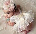 お花のヘッドバンドがセットになった、ふわふわフリルが魅力のニューボーン向けロンパースドレス。