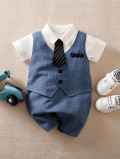 シャツとパンツが一体になったロンパースにベストを重ねたセットアップ。