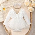 ハート柄のチュールスカートがふんわり広がるロンパースに、同素材のヘッドバンドが付属する2点セットです。